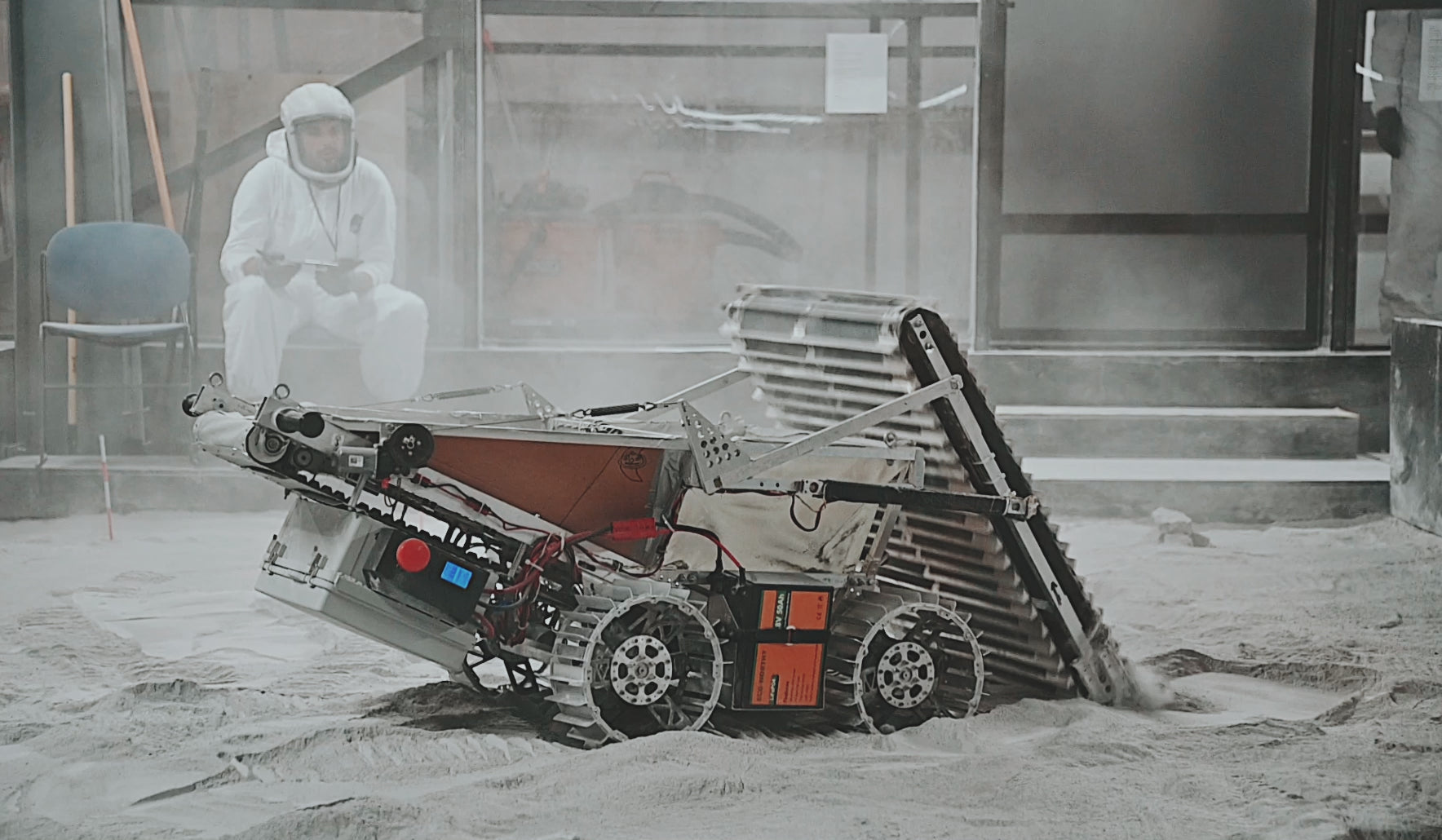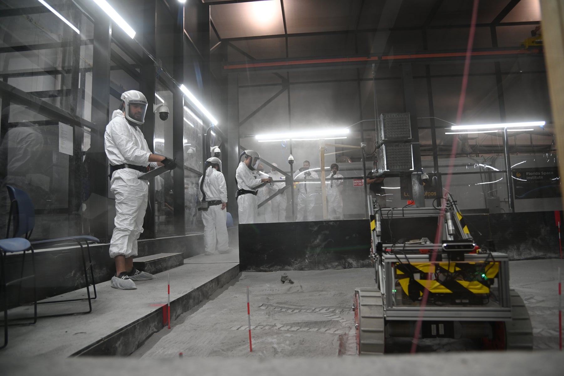 Exolith Lab CRATER regolith bin (UCF/FSI): filled with 120+ tons of LHS-2E for lunar hardware testing.